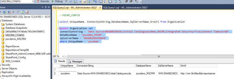 connectionstring = ‘Data Source=NEWDBSERVER;Initial Catalog=pocdemo_MSCRM;Integrated Security=True;Connect Timeout=60’,