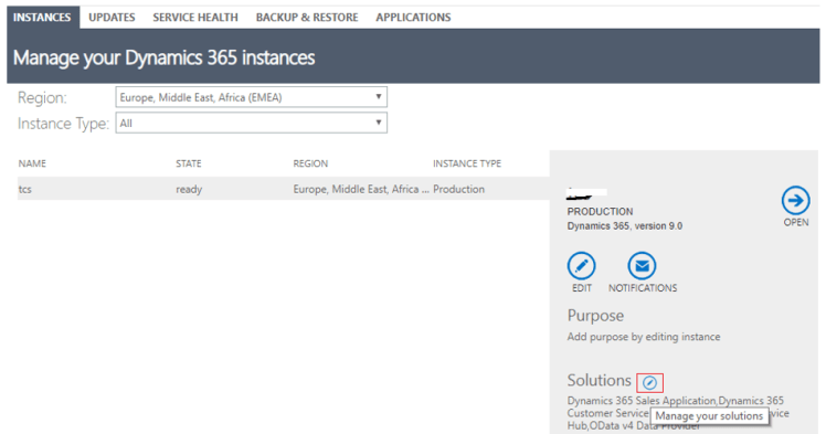 - From Admin Center, access the Admin page for Dynamics 365