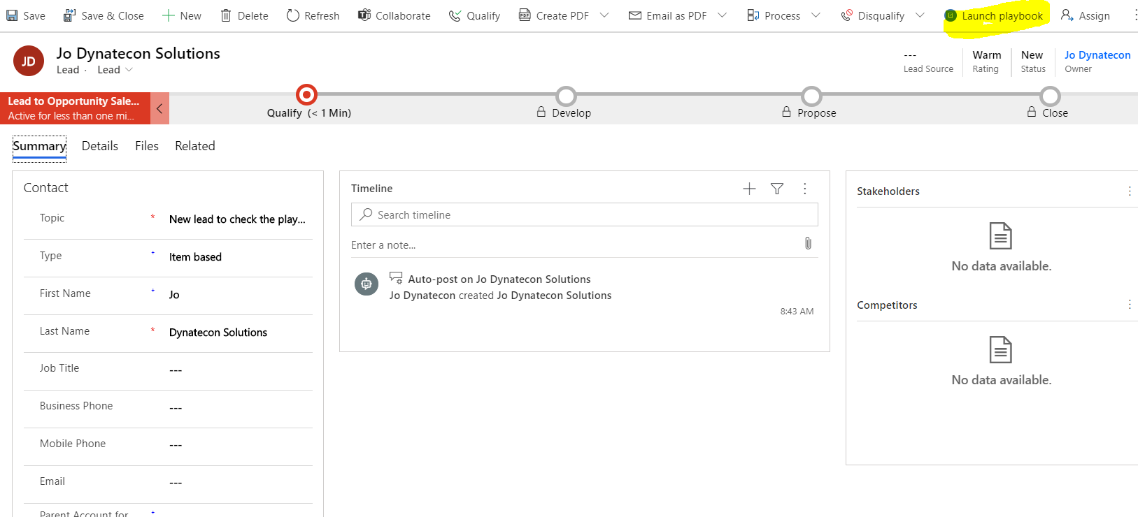 6. Users with Playbook user role would now be able to launch the playbook from the respective entity record [ in our case lead record]