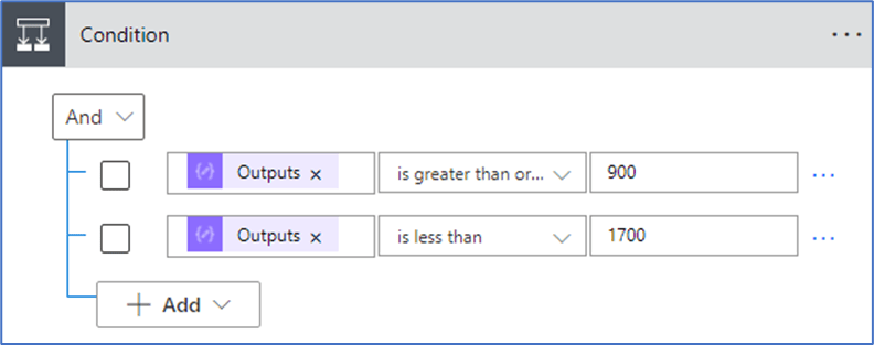 Give the expression ‘mul(int(outputs(‘Get_Hour’)),100)’. It converts the hour in string format to integer format. The result is multiplied with 100 for easier comparison of time.