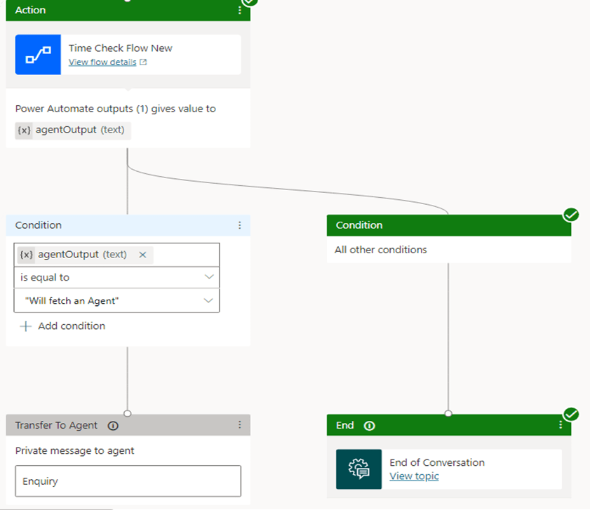 If the string present in the variable ‘agentOutput’ is “Will fetch an Agent” it implies that the enquiry is within the working hours hence it can be transferred to a human agent. Else if the string present in the variable ‘agentOutput’ is “No agent available now” then the chat must be ended.