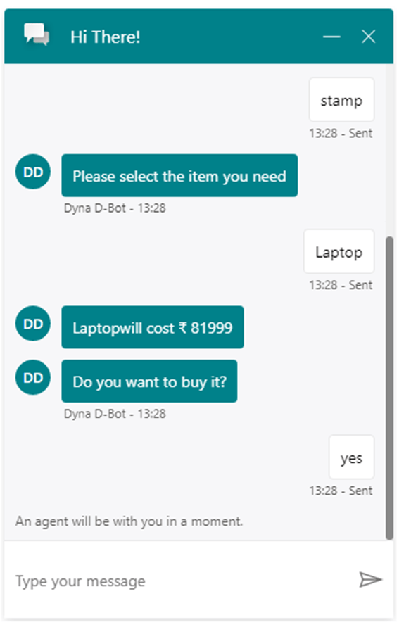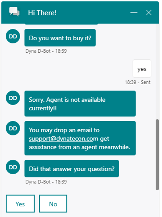 In the below figure (Fig. 19) the enquiry is made at 6:39 pm which is after working hours. So, the chat bot displays “Sorry Agent is not available currently” message.