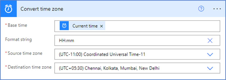 Give the output from the previous step as Base time input, we need the time in 24Hr format hence ‘HH:mm’ is given in Format string field. Source time zone can be selected as Coordinated Universal Time from the dropdown. And the Destination time zone can be selected as IST from the dropdown.
