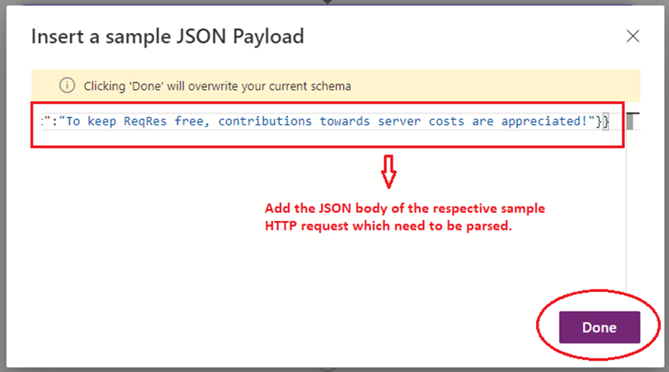 As shown in Fig.3, in the ‘Content’ box give the output ‘Body’ from the response received from the previous HTTP action. In order to provide the sample JSON body, click on the ‘Generate from sample’ and add the JSON body of the respective sample HTTP request (https://reqres.in/api/users?page=2), that need to be parsed and select ‘Done’ as referred in Fig.4 above.