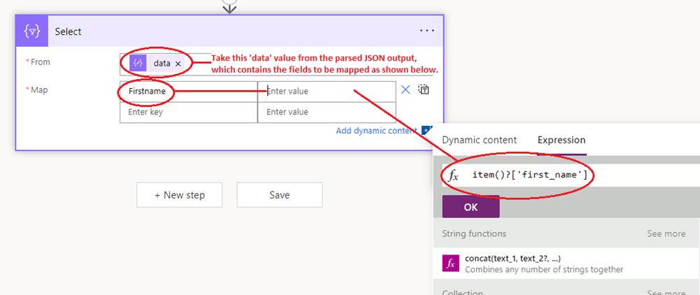 As mentioned in the Fig.6, the ‘From’ box will contain ‘data’ output from the parsed JSON action. In the ‘Mapping’ section, we need to provide the keys such as Firstname, lastname, email and image which need to be mapped from the ‘data’. Also, certain expressions are used for mapping field values, i.e., expression used for the field ‘Firstname’ is shown in the Fig.6 above.