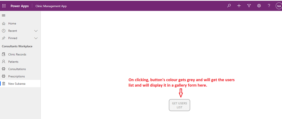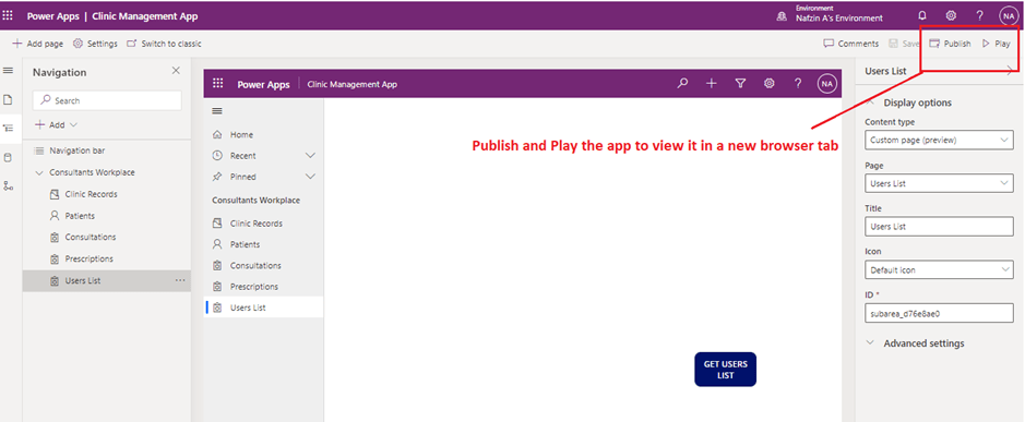 A canvas custom page named “Users List” need to be created which will contain a button called “GET USERS LIST” and on clicking the button, it calls for a flow to get users details and send back the response to this custom canvas page.