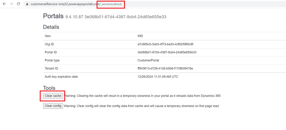 Step 3: The portal details page will be opened as depicted in Fig 3. Click on the ‘Clear Cache’ button to clear the cache.