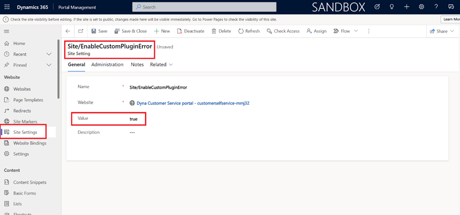 - Go to Portal Management App > Site Settings > Add a New Site Setting (if there is none) and set the value to “true” as depicted in Fig 5.