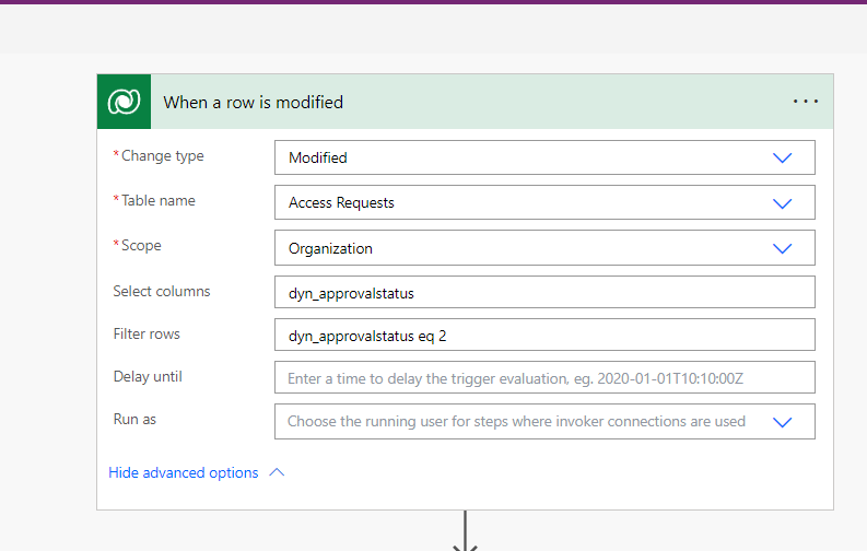 Create an automated cloud flow. Here when a row is modified is the trigger. ie when the value of the approval status is equal to 2 or ‘approved’ the flow will trigger. Access Requests is the table that stores the registration information that is submitted through the portal(Fig 1) which is mentioned above.