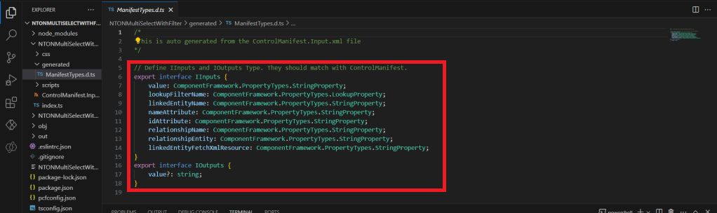 Note: It’s essential to update the ManifestTypes.d.ts file after adding the code by running the command npm run build. This step ensures that your PCF component correctly recognizes and utilizes the newly added property.