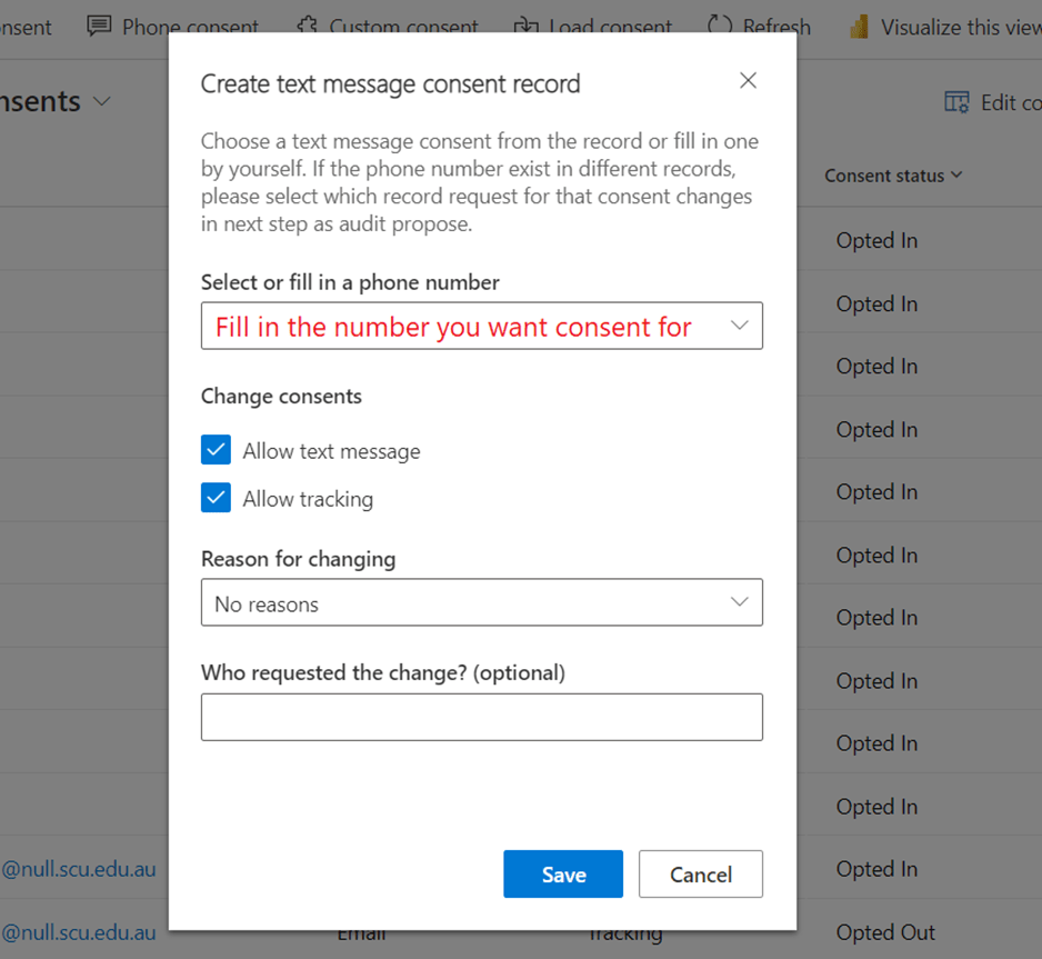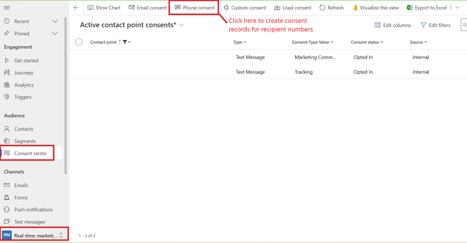 Thus, for managing consent for text messages, you can go to Marketing App > Real-Time Marketing > Consent Center. Click on the ‘Phone Consent’ option on the ribbon to create contact point consent records for the respective recipient’s number as shown in Fig.3 below.