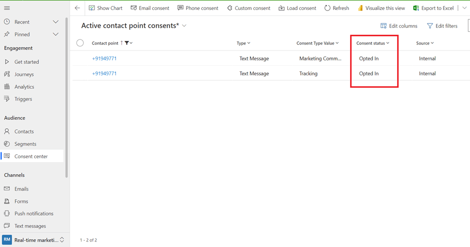 After entering the recipient’s number for which you need consent and enabling the tracking options as shown in Fig.4, the contact point consent records with the status ‘Opted In’ will be created in your Real-time marketing consent center as shown in Fig 5.