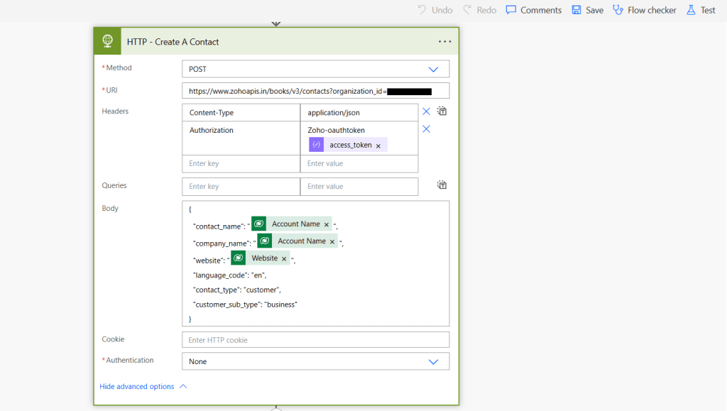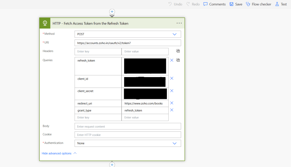 - Access Token Retrieval: Use the HTTP connector to obtain an access token. This token is necessary for authentication when accessing Zoho Books’ API.