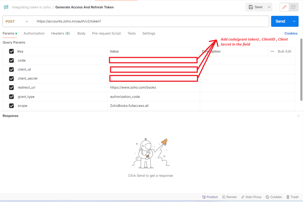 Replace YOUR_CLIENT_ID with your actual client ID provided by Zoho. Additionally, replace https://www.example.com/redirect with the actual redirect URI configured in your Zoho API settings. This URL will initiate the OAuth authorization flow for your application, enabling access to Zoho Books contacts with the specified permissions and also create a grant token which will enable to fetch refresh and access token.