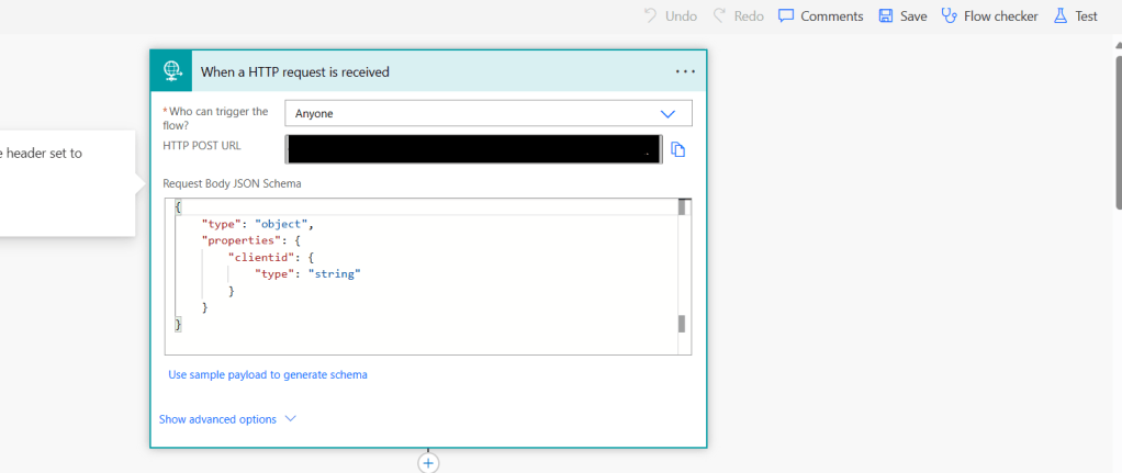 'When a HTTP request is received'This trigger will be activated when the custom button is clicked in Dynamics 365, passing the client ID to initiate the flow.