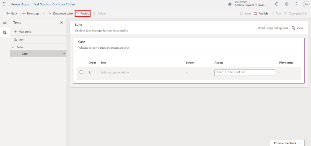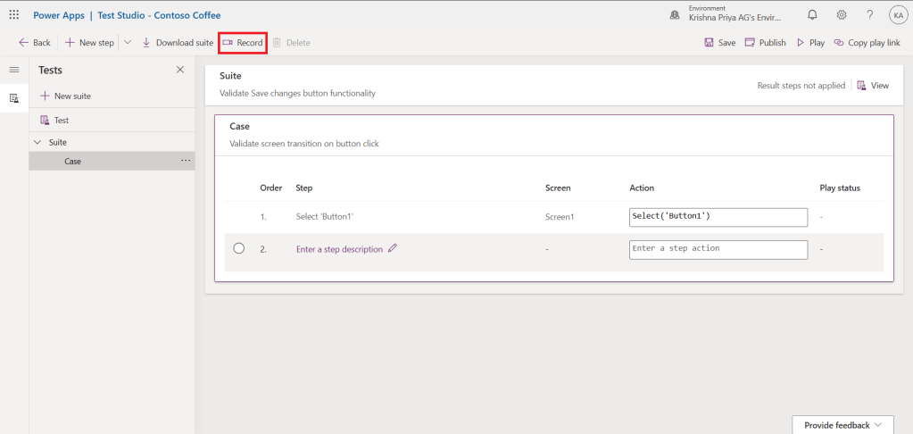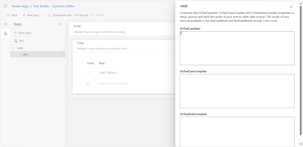 By default, a test suite and test case are created for you in Test Studio. Test suites are used to organize your test cases. An app can contain one or more test suites. You can use the default test suite and case or create a new test suite.