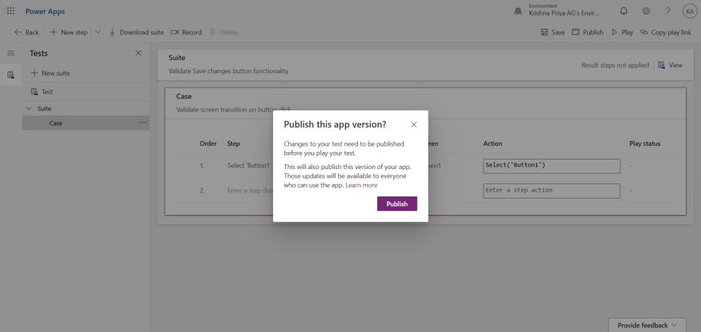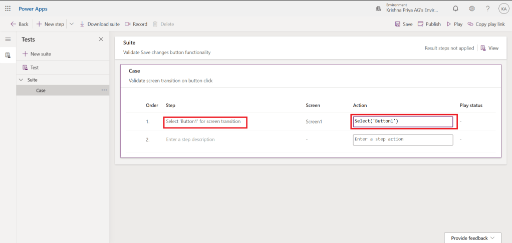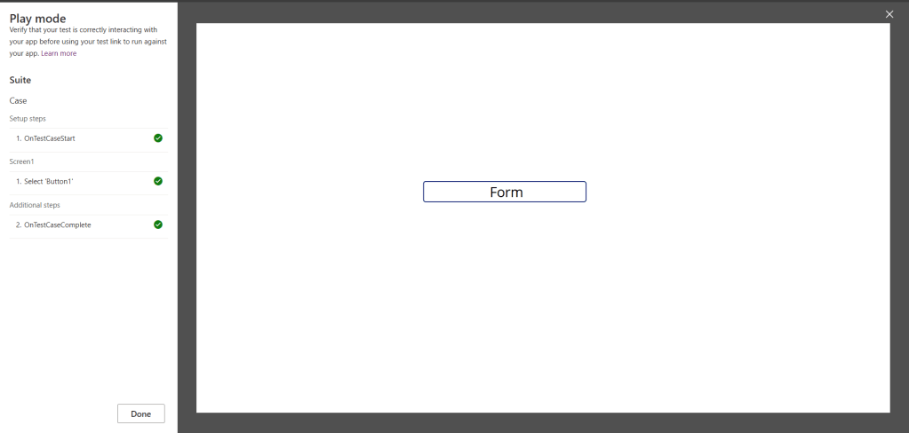 Select Play. The published app opens in Play mode, and you can see your test steps playing back automatically. A green check mark indicates when a test step is executed successfully. If a step fails, a red failure indicator along with a failure message is displayed.