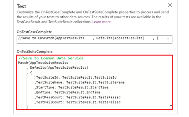 5.Input an expression to process the results of your test. In the following sample, you’ll save each test suite’s results to the custom App TestSuiteResults table in Dataverse.