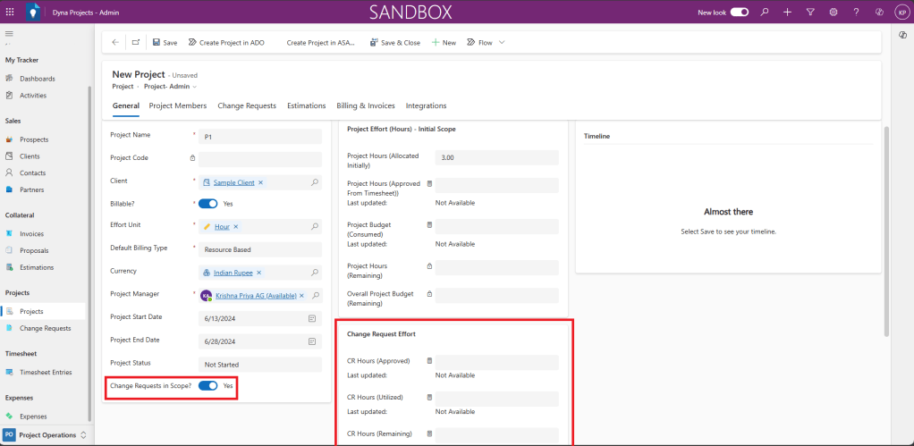 Once you select ‘Yes’ from the toggle button for ‘Change Requests in Scope?’ field, ‘Change Request Effort’ section will be shown in the form.