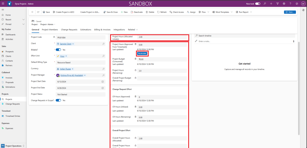 Based on the value entered in the Project Hours(Allocated Initially), all the other fields under will be auto-calculated. You also have a Recalculate button available to recalculate the values.