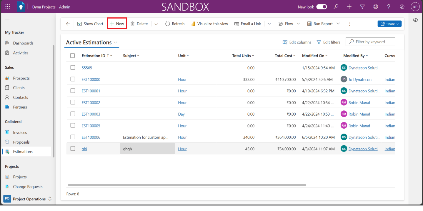 3. From Active Estimations list view, click on ‘+New’ button at the top.