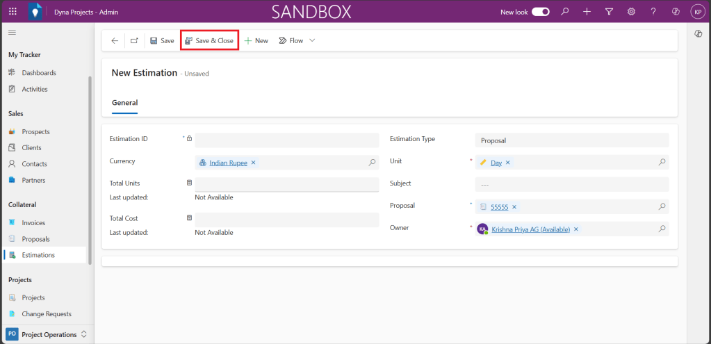4. New Estimations form will get opened, fill all relevant fields in the form.