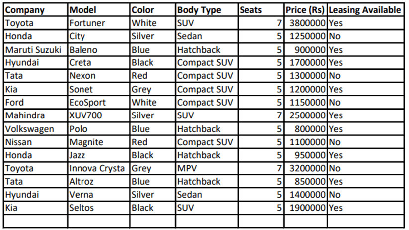 To enable the AI assistant to intelligently respond to user requests, I created a structured vehicle database in SharePoint. This database was designed as a table within an Excel file, containing key details for each available car such as the Company, Model, Color, Body Type, and Number of Seats. These columns provide a well-organized dataset that helps the Copilot retrieve precise information when a user inquires about specific vehicle preferences.
