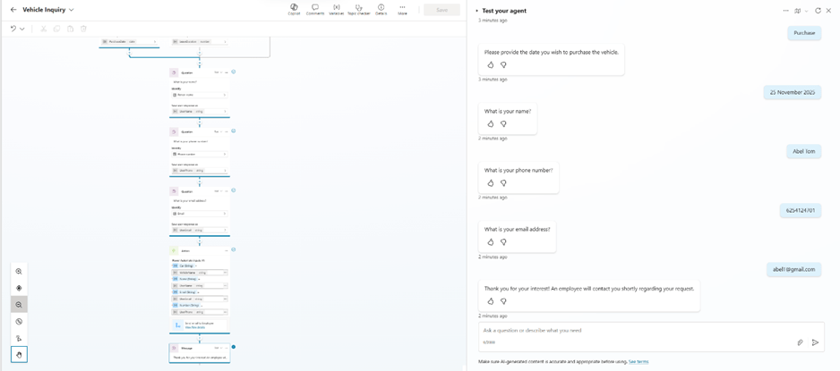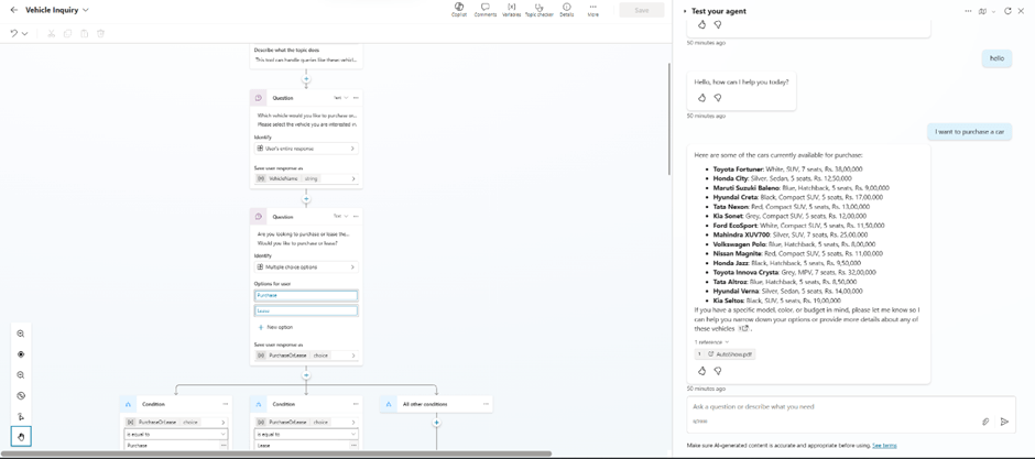 In Microsoft Copilot Studio, two key topics were created to manage user interactions smoothly. The “Vehicle Inquiry” topic is triggered when a customer expresses interest in leasing or purchasing a car with phrases like “I want to lease a car,” “vehicle confirmation,” or “confirm to purchase the vehicle.” This topic guides the conversation by collecting relevant details from the customer, such as the vehicle model and their preference for lease or purchase.