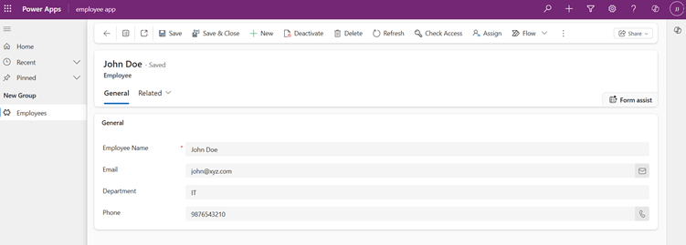 The Copilot can create or retrieve employee records directly from the Employee table in Power Apps. - Conversational Data Handling