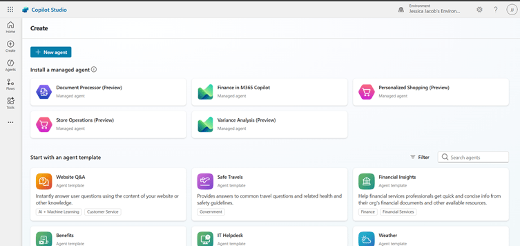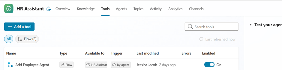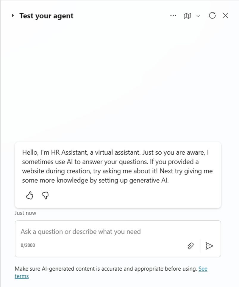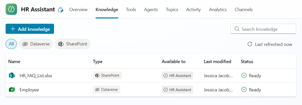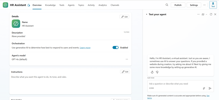 - Open Copilot Studio → Create Agent → Name: HR Assistant.