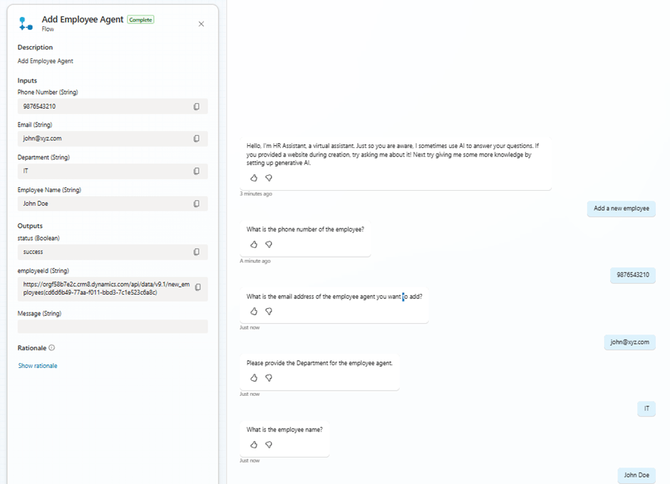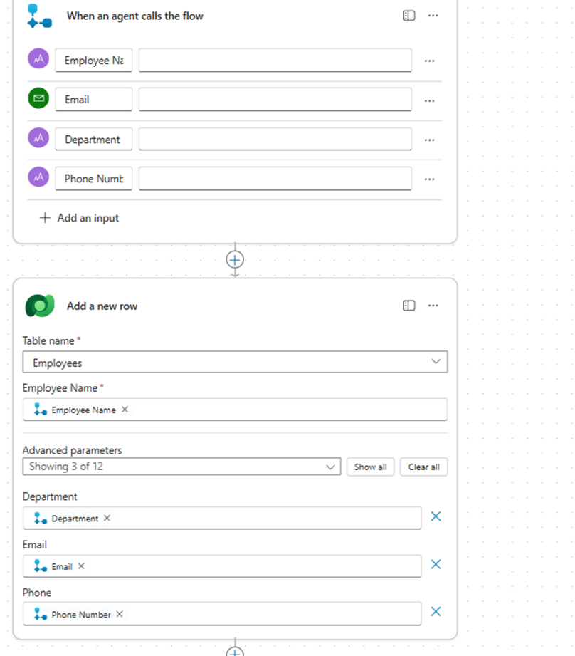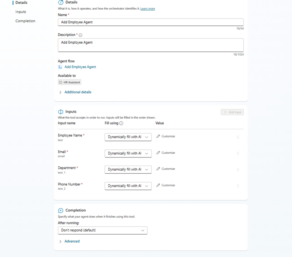 - Copilot will show the flow inputs (FullName, Email, Department, Phone) — map the agent slots to these inputs.