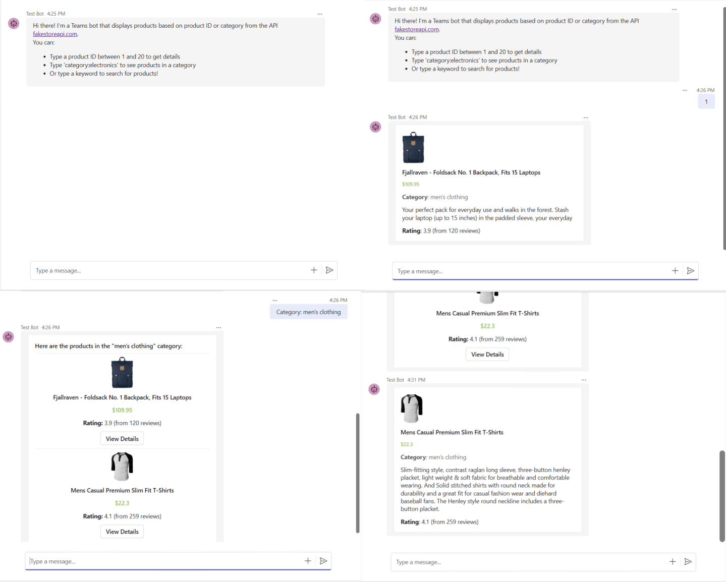 In this blog, we’ll walk you through the steps to create a Microsoft Teams bot that allows users to display product details by product ID, category, or search query using an external API. The bot is built using the Bot Framework SDK and interacts with Fake Store API, which provides sample product data perfect for testing.